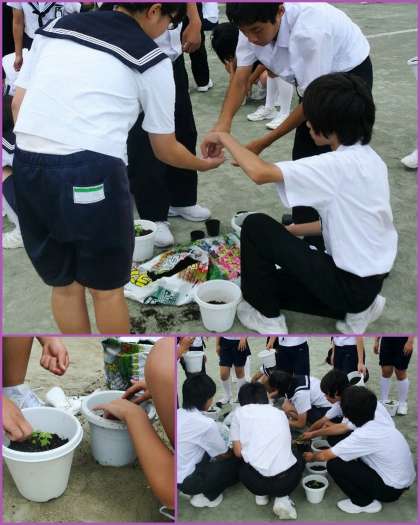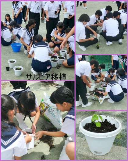 7月13日 サルビアの移植 公開日 2015/07/13 更新日 2015/07/13 SDGs 各学級で、種から育ててきたサルビアは、緑化委員の手で黒いポットに植え替えられ、今日まで大切に育てられてきました。その苗を、今日は植木鉢に植え替え、自宅に持ち帰りました。夏休み中は、皆さんの責任でサルビアを育てます。生物を育て自然を愛する心が育つことを期待しています。9月には、真っ赤な花をつけたサルビアが学校に集まり、体育祭を華やかに彩ることでしょう。