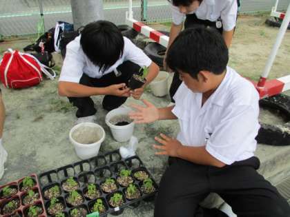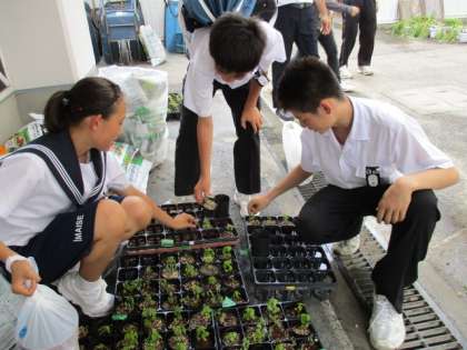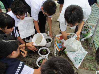 今日の午後、蒸し暑いなかでしたが、1〜3年の全生徒がグランドでサルビアの鉢植え作業を行いました。緑化委員やリーダー会の生徒たちが、鉢・苗・培養土・肥料の準備や片づけを分担し、各クラスの作業が滞りなく進むように働いていました。