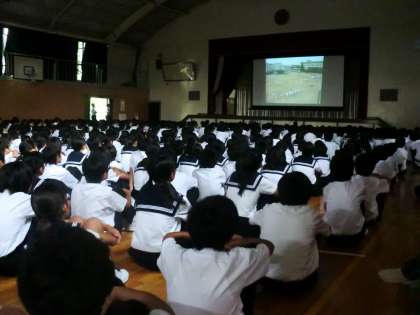 700人からいる屋内運動場ですが、雨音以外聞こえません。全員が画面に吸い込まれ、彼のことを自分のことのように考える時間が続きました。1学期の最後に、とても考えさせられ、感動できる時間を全校で共有できたことをとても嬉しく思います。