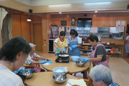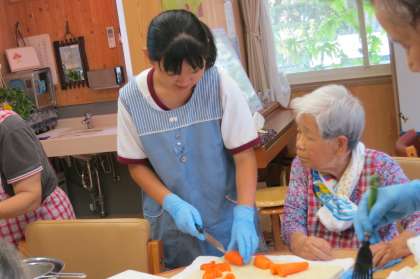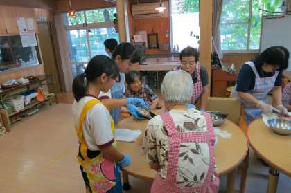 市内の高齢者福祉施設でボランティア体験をしています。写真は利用者さんと一緒に昼食のカレーを作っているところです。午前中はラジオ体操をしたり、手遊びをしたりしました。さまざまな体験ができ、夏休みの貴重な一日になったことと思います。