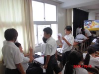 朝、1年生の昇降口にて緑化委員が募金活動をしている様子です。この運動は、緑をふやし、緑をまもり、緑をひろげる活動です。活動は14日まで行われます。