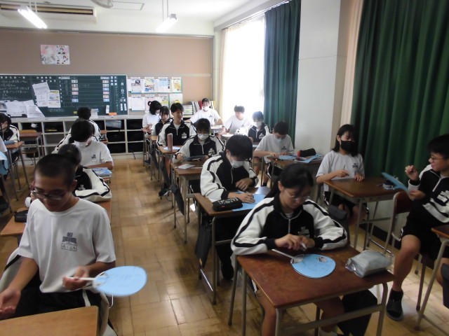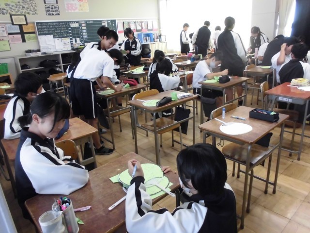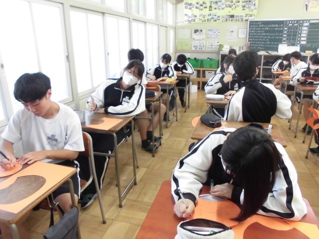写真は、クラスのメンバー1人1人へメッセージを書いている様子です。