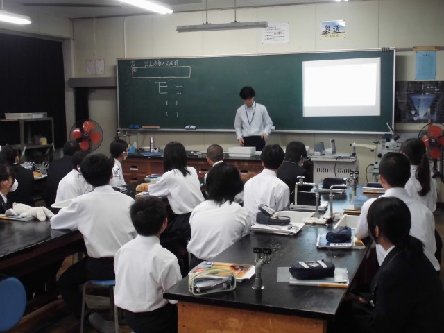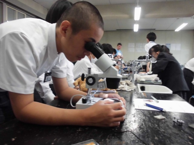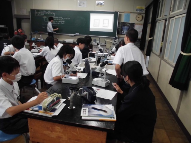本日の授業の様子です。顕微鏡を使い火山岩の特徴を調べ、まとめていました。普段は見ることのできない細かな模様に興味深々な様子で目を輝かせていました。