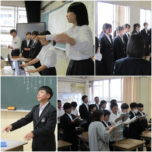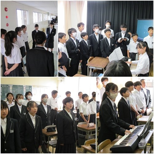 10.24 合唱練習(1年) 公開日 2025/10/24 更新日 2025/10/24 1年 合唱コンクールまで、あと1週間となりました。今日も各学級で練習を行いました。 どのクラスもよりいい歌声を響かせようと、時間いっぱいまで練習しています。