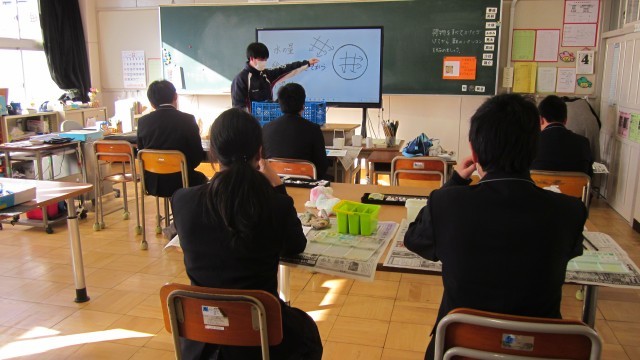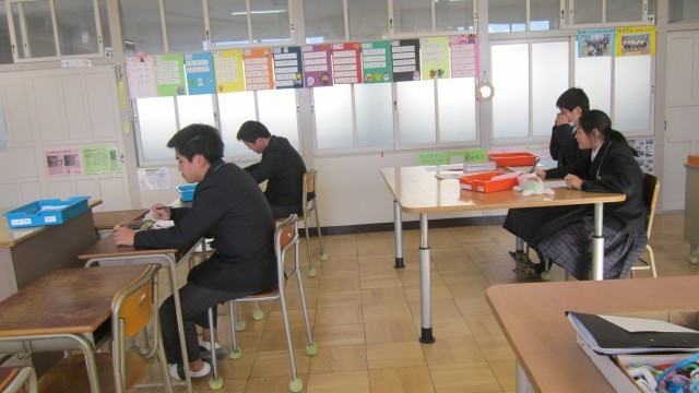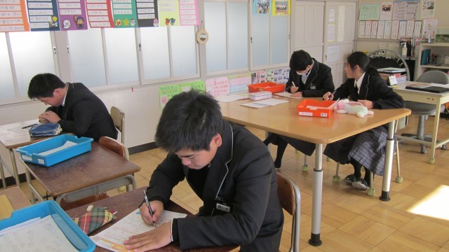美術の授業では、教育展出展に向けて、漢字一文字のレタリングの作成をしています。各生徒が自分の選んだ文字を丁寧に鉛筆で下書きして、絵具で描いていました。