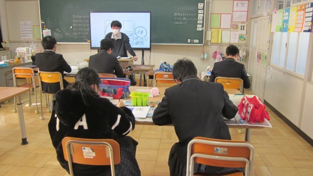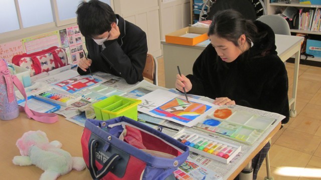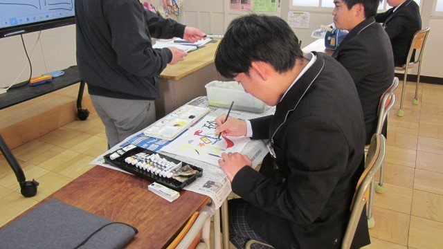美術の授業では、文字のレタリングで、生徒それぞれの好きな思い入れのある漢字一文字を鉛筆で下書きして、ポスターカラーで色を付けて仕上げます。筆を使って丁寧に作業していました。