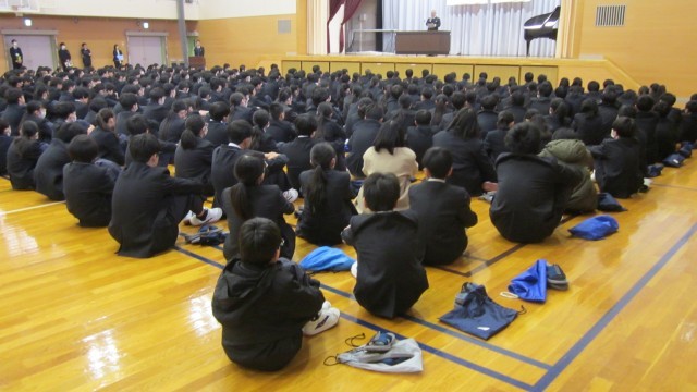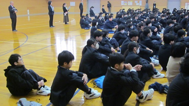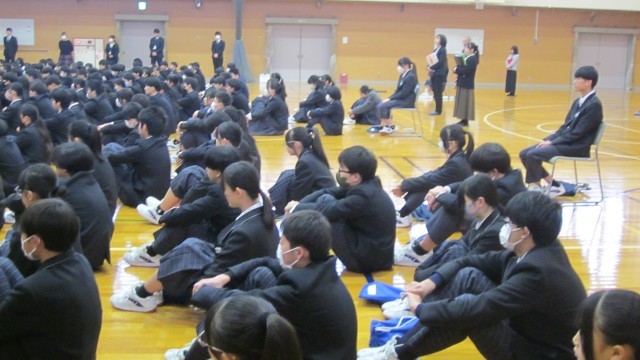 本日、終業式が屋運で行われました。6・7・8組の生徒たちもそれぞれの交流クラスに入って、式に参加しました。寒い中でしたが、落ち着いた雰囲気の中で、静かに先生方のお話しを聞くことができました。2学期のよい締めくくりとなりました。