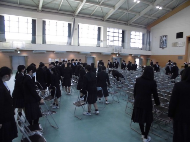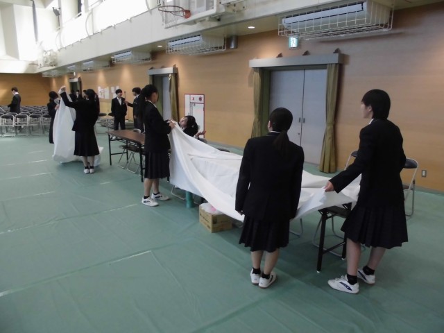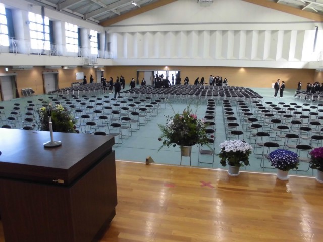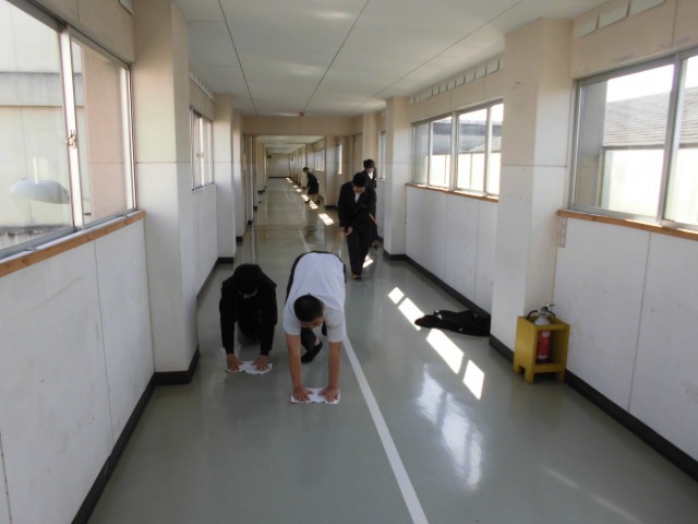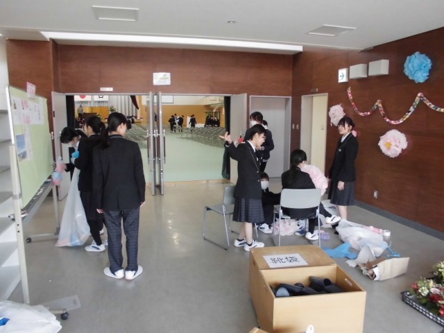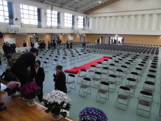 今日の午後は,卒業式の準備を行いました。体育館内の準備はもとより,北舎・南舎の1・2階や渡り廊下,昇降口,階段,トイレなどの清掃を行いました。