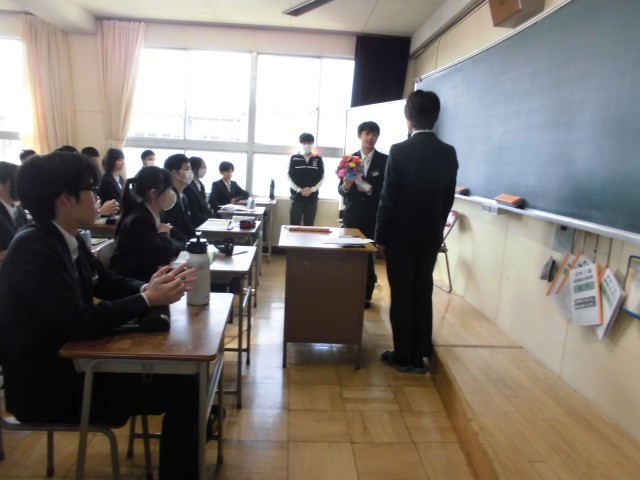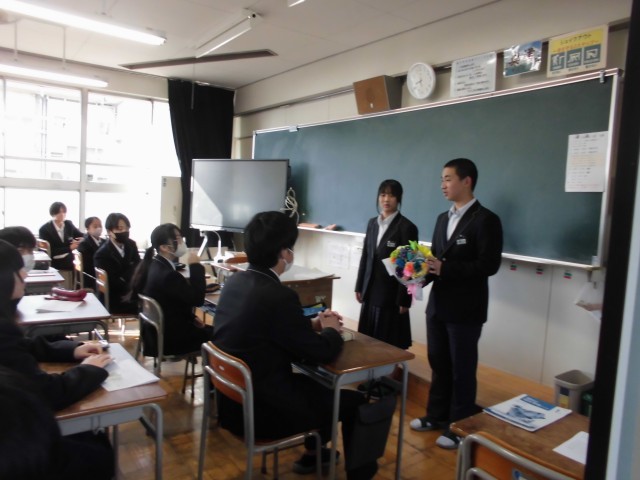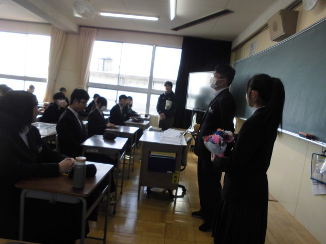 卒業生を送る会を開いてくれた在校生に感謝の気持ちを伝えようと、3年生が手作りの花束を贈りました。