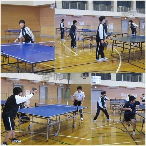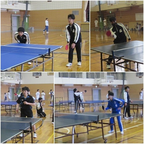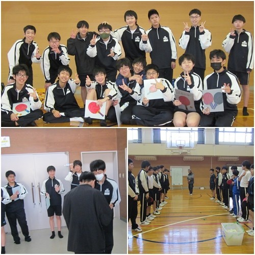 本日の部活動は、昨日卒業式を終えたばかりの3年生を招いて、1・2年生部員とのOB戦を行いました。3年生にとっては夏の大会を最後に引退してから、久しぶりに卓球をした生徒も多くいましたが、1・2年生と練習するうちに感を取り戻して素晴らしいプレーをする3年生もたくさんいました。1・2年生も日々の練習で身に着けた技を3年生に披露して、お互いが切磋琢磨してよい部活練習となりました。団体戦では3年生が先輩の意地をみせて勝ちました。最後は後輩から先輩にお世話になったお礼のメッセージを書いた色紙を渡しました。受け取った3年生も喜んでいました。