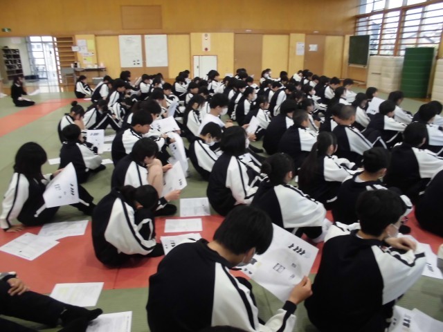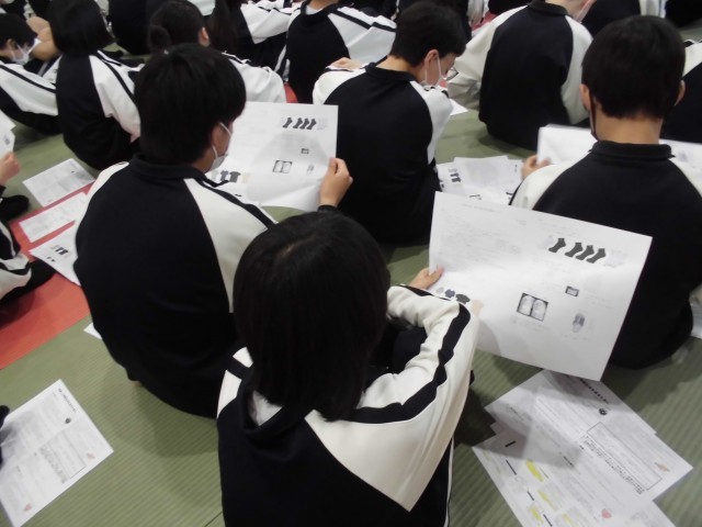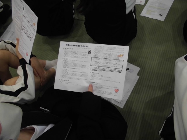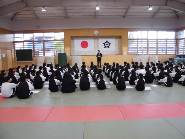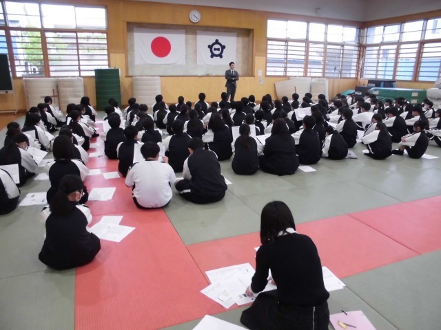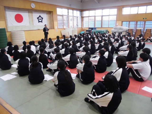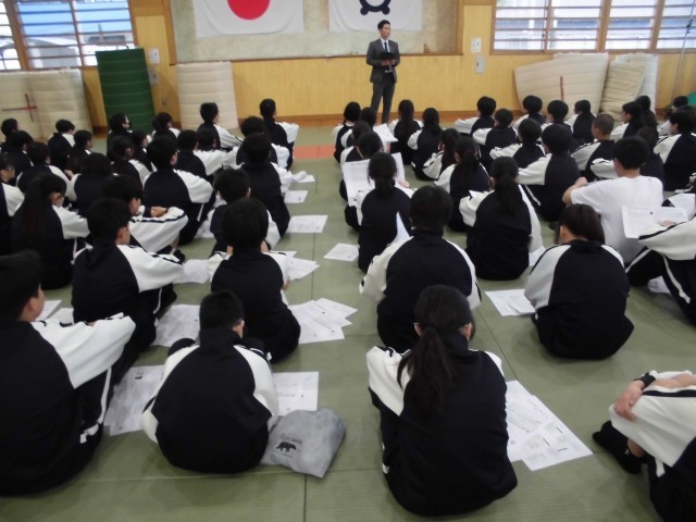 武道場で初めての学年集会を行いました。先生方の自己紹介や生活面・学習面の話などを聞きました。