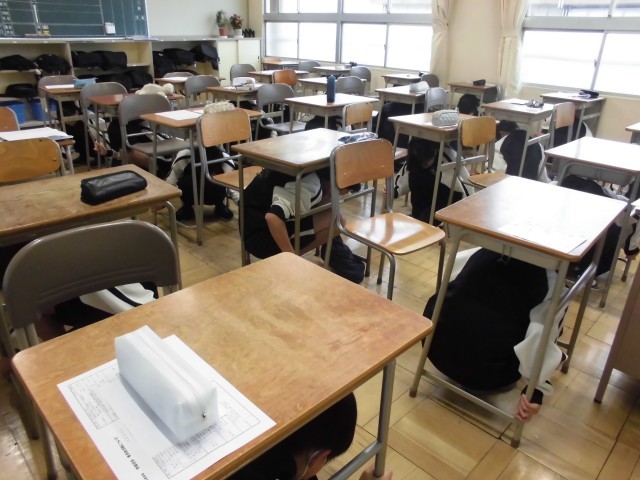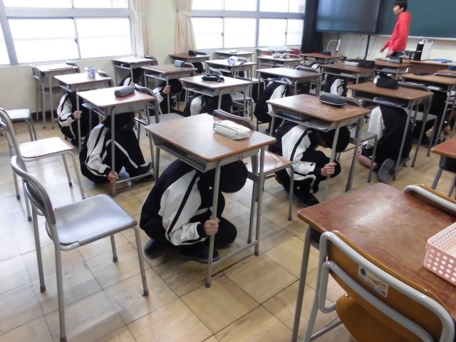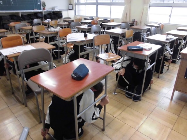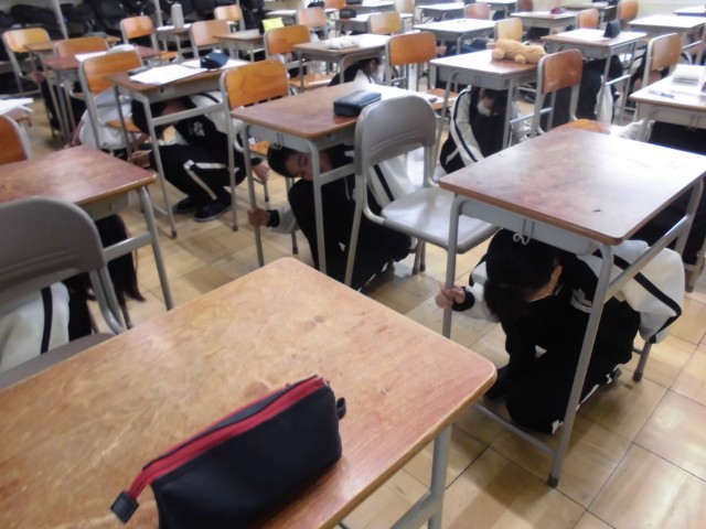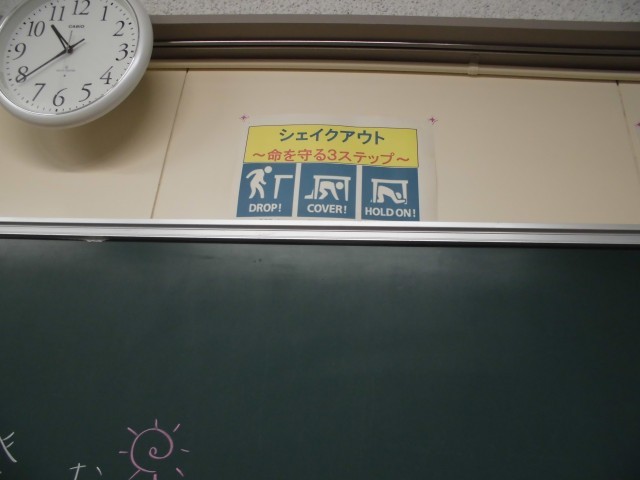 避難訓練を行いました。緊急地震速報の放送に合わせてシェイクアウトの姿勢を取りました。今日は雨天のため,校内の避難経路の確認を行いました。