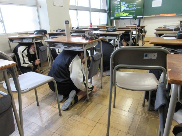 避難訓練では、シェイクアウトの姿勢を取り講話を聞いたあと、避難経路の確認を行いました。