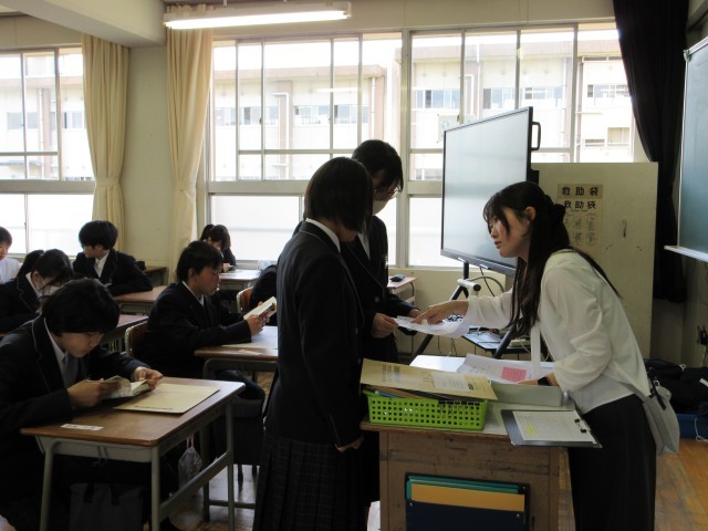 教室に入ってから、荷物を机の引き出しに入れ、提出物を出しました。