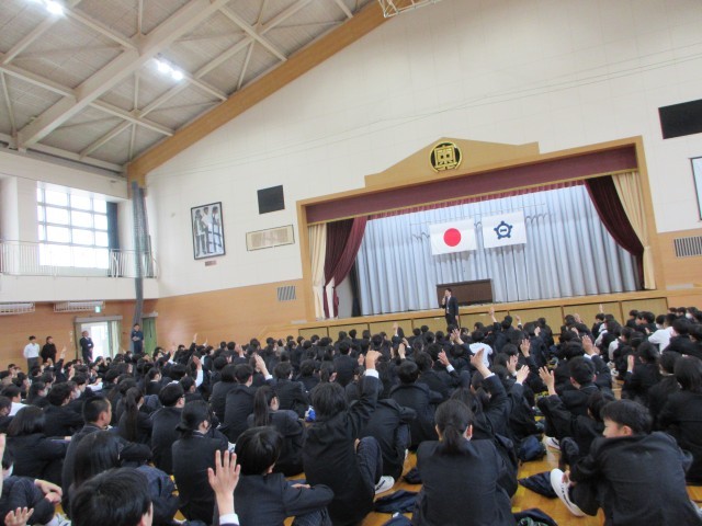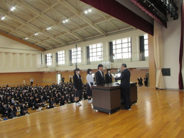 全校集会が行われました。生徒指導の先生より出会いについてのお話しを聞き、良い出会いにするために、自分を守るためにルールを守りましょうというお話がありました。また、任命式では、生徒会をはじめ学級のリーダーや委員長が任命されました。生徒会長は立派に所信表明をしていました。