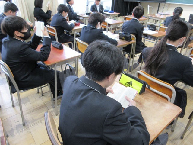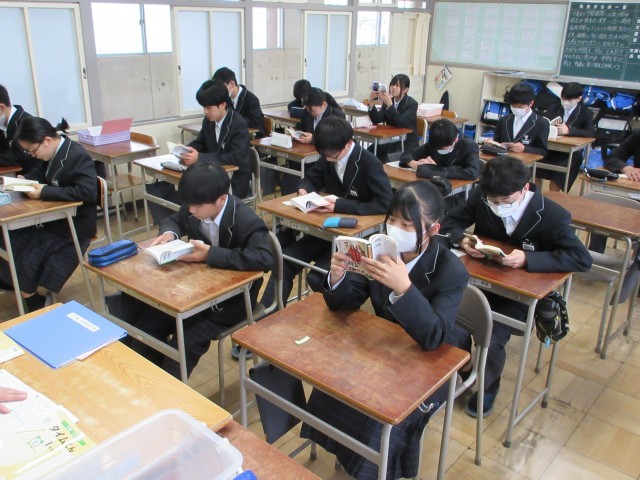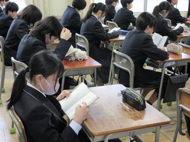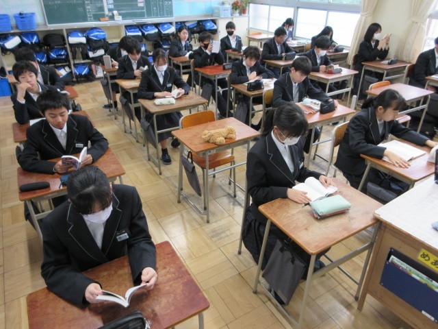 火曜日と木曜日の朝の時間は、読書です。15分×2日で、週に30分間と短い時間ですが、どの生徒も自分の好きな本を夢中になって読んでいます。落ち着いた雰囲気で一日がスタートさせることで、授業にも集中して取り組むことができています。