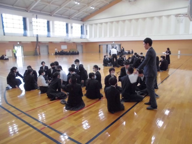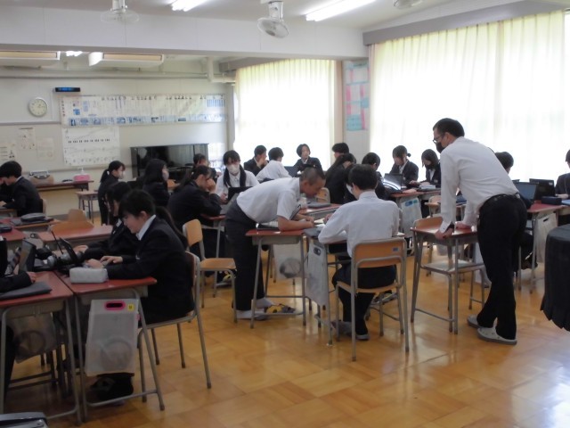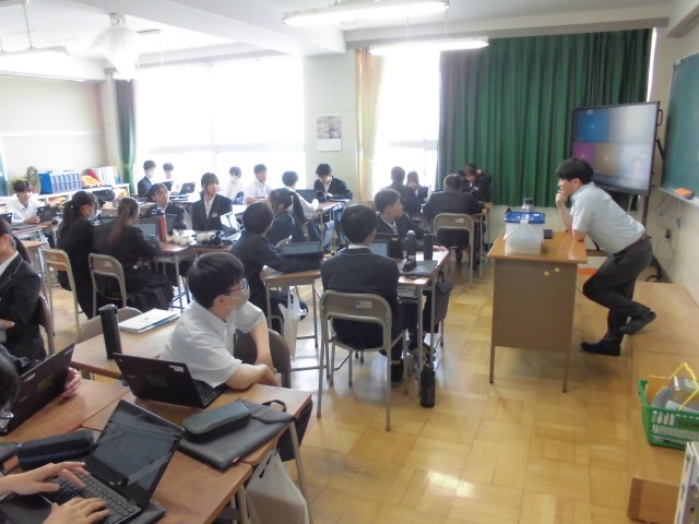 生徒が司会を務め主体的に展開される授業、青空のもと中庭に出て植物を観察する授業、学年をオンラインで結んで共通の指示を出しながら班別活動を行う授業、屋内運動場で宿泊行事のシミュレーションを行う授業などが行われていました。