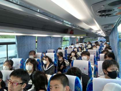 奥中学校3年生修学旅行のバスは、順調に学校に向かって進んでいます。