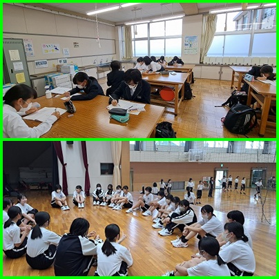 6.6 仮入部の様子 公開日 2023/06/07 更新日 2023/06/07 1年 久しぶりの部活動です。途中雨に降られ、中止になった部活や屋内でのトレーニングに代わった部活もありました。バレーボール部は応援の仕方を教えてもらっていました。