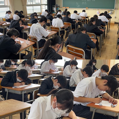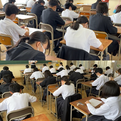 6.8 平常テスト(2年) 公開日 2023/06/08 更新日 2023/06/08 2年 1限目に国語と英語の平常テストを行いました。 明日は、理科と数学です。 しっかりと勉強して臨んでください! 目指せ満点!!