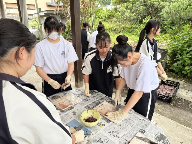 アジの干物体験中です。