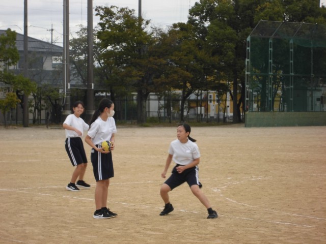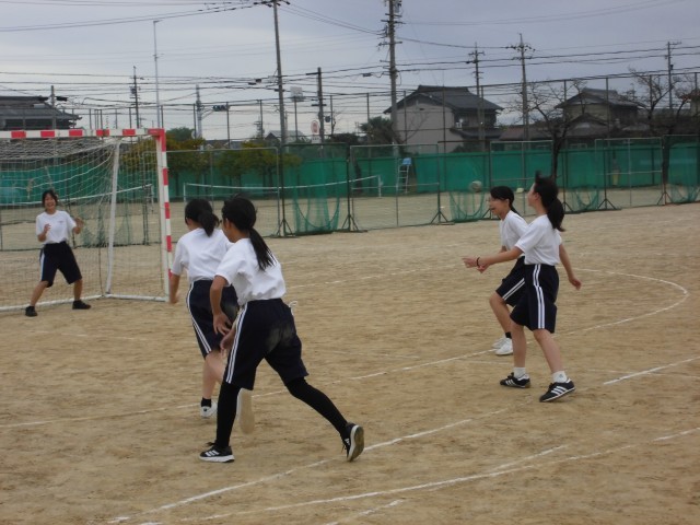 体育の授業では、ハンドボールを行っています。どのように攻めたらゴールを狙えるのか!みんな考えながら、動くことができました。