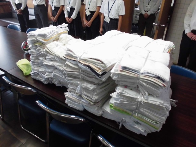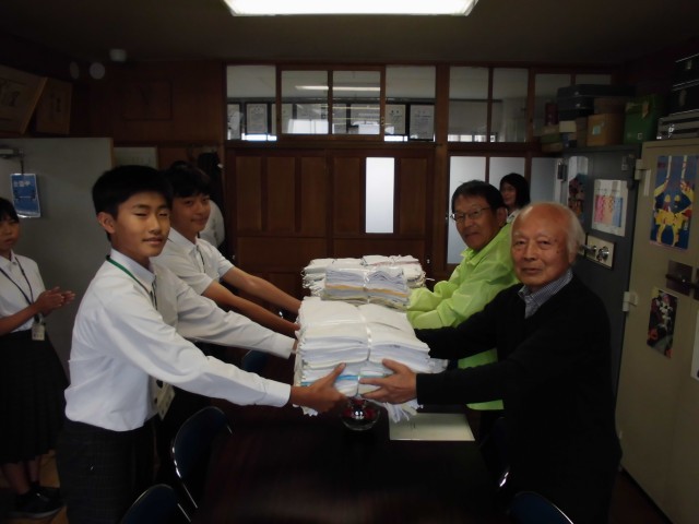 本日老人会から2名の方が来校され、手作りの雑巾をいただきました。生徒会が代表として手渡しで受け取りました。「『萩原中』は建物ではなく、君たち一人ひとりである」という言葉を真摯に受け止め、大切に使っていきたいと思います。