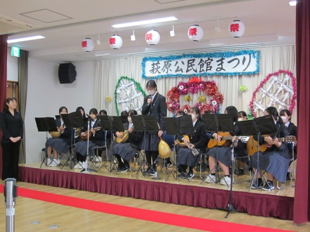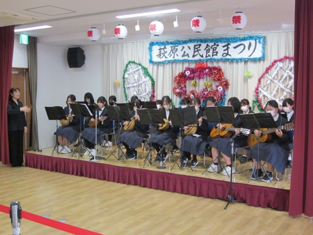まずは萩原町青少年健全育成会のポスター表彰で本校の1年生が表彰されました。表彰式後には、ギター・マンドリン部の演奏で公民館まつりがスタートしました。この演奏に合わせて参加された地域の方たちが「高校3年生」や「ふるさと」の歌を口ずさんでいました。また、公民館の会議室には美術作品などいろいろな作品が飾られており、本校の3年生の美術作品の自画像も飾られていました。鑑賞された方からは「さすが中学生ですね」とお声をかけていただきました。
