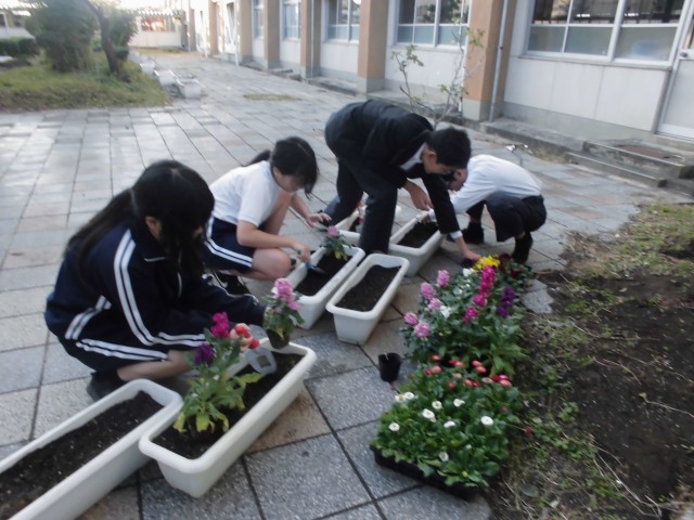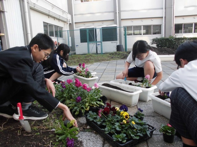 部の生徒達は組み合わせを考えて、プランターに植えました。