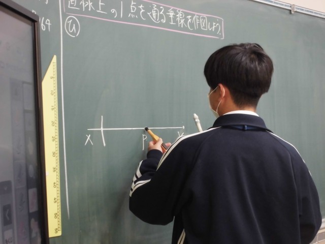 数学の授業で、作図を行っています。どのように作図をすれば垂線が引けるか、みんな真剣に考えることができました。
