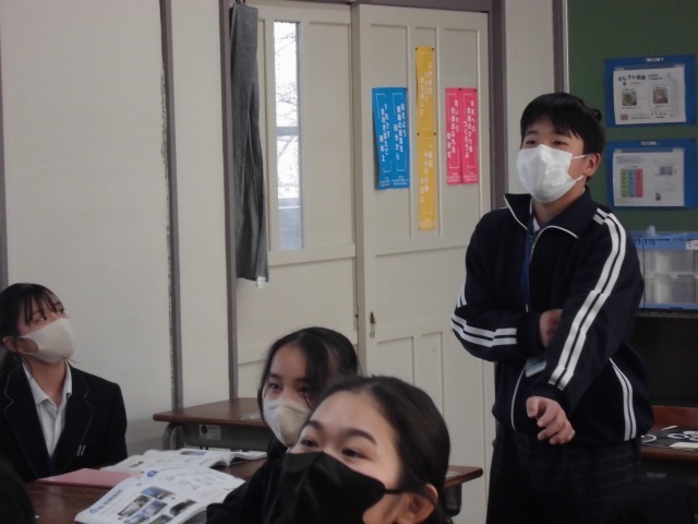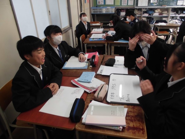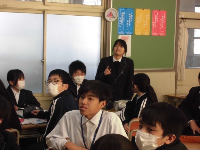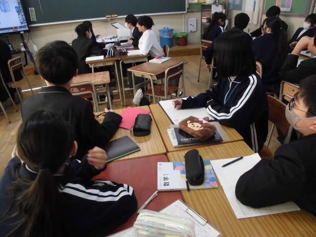 数学の授業で、立体の仲間分けをしました。それぞれのグループで、いろいろな分け方がありました。立体の特徴を、しっかり把握することができました。