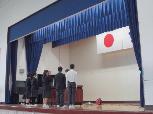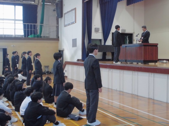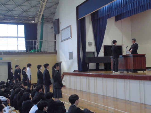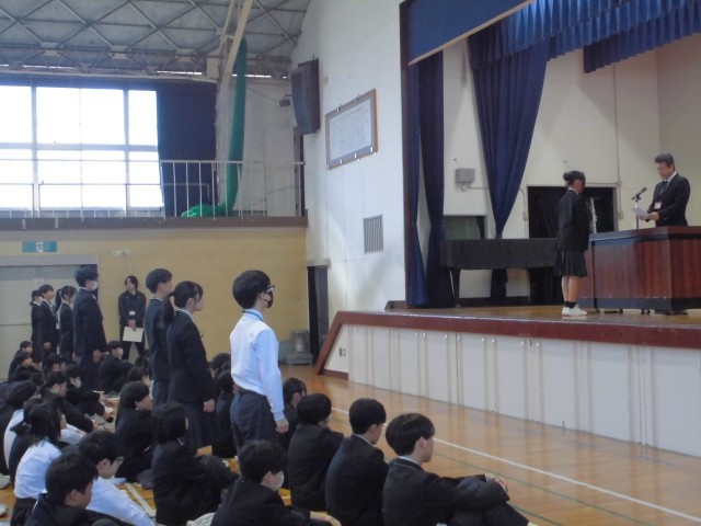 本日は1時目目の前に全校で屋内運動場に集り、前期の任命式があり、生徒会役員、学級委員、書記、議員、各委員会の委員長の任命をしました。