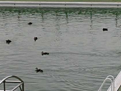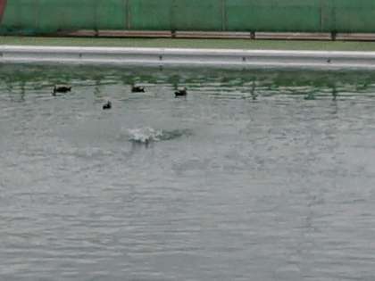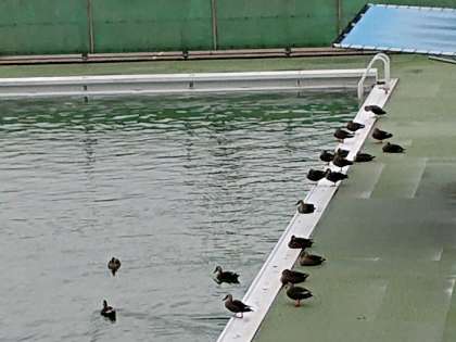 体育の日に、プールを覗いてみると、珍しいお客さんがいて驚きました。ちょうど水鳥たちの休息の場になっていました。夏のプールとは違う来客で賑わっていました。水鳥が水の中に潜っていく姿や、羽を広げて水音を立てるところは、見応えがありました。