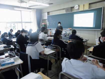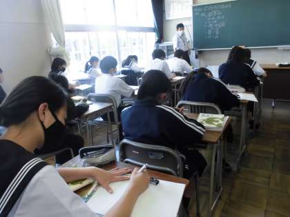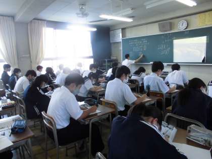 写真は3−1社会、3−3数学、3−4英語の授業の様子です。先生の話を聞いてノートを書いたり、パワーポイントで進出単語を学んだりしているところです。