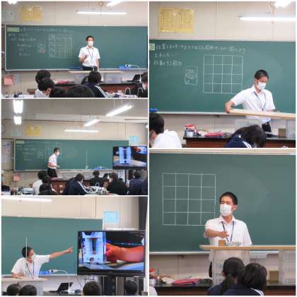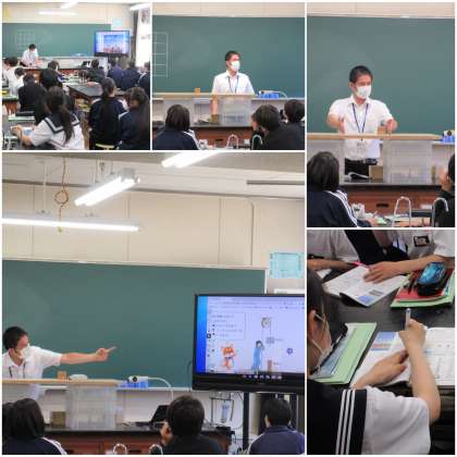 3年生の理科では、『位置エネルギーの大きさは何に関係しているか』というめあてのもと授業を行いました。おもりの重さや高さを変えて実験を行い、そこから法則を見つけ出そうとしています。