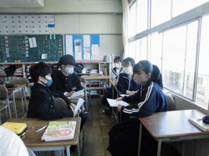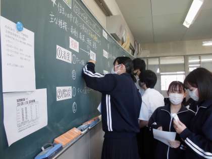 写真は3年3組の家庭科の授業の様子です。住まいの安全について、まず個人で家の中の危険が潜む場所とその対策を考えてから、班で意見を出し合って黒板に書きました。家の中に危険な箇所がないか、見直すきっかけになるといいですね。