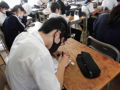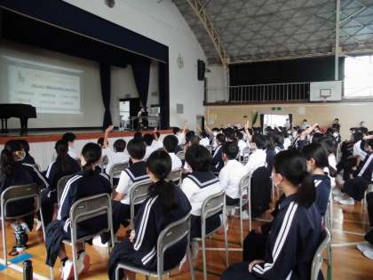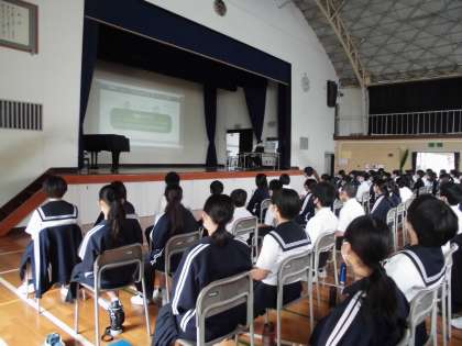 屋内運動場で、情報モラルについての話を聞きました。自分の写真や個人情報をインターネット上に載せることによる危険や、相手のことを思いやったメッセージのやりとりの大切さを学びました。