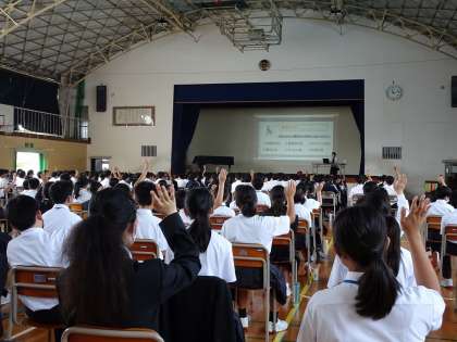 期末テスト後、屋内運動場にて情報モラル講座に参加しました。