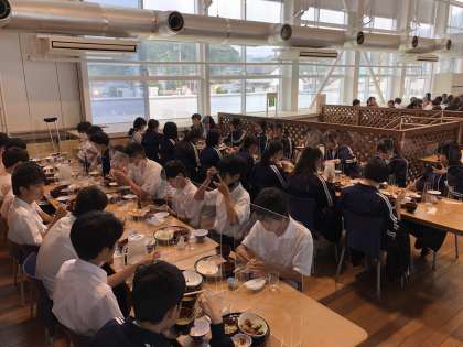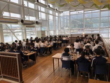 待ちに待った昼食です。朝が早かったので、みんな腹ペコです。コロナ対策として黙食を心がけています。