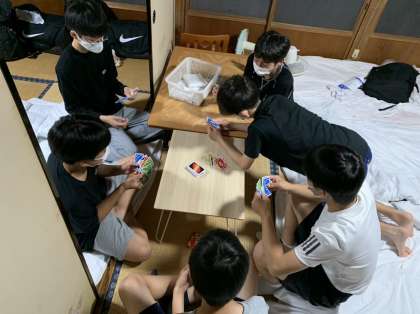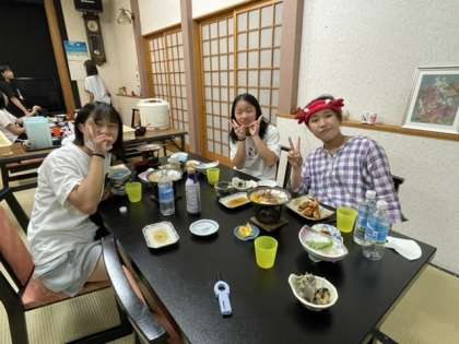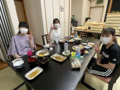 のんびりと過ごし、お風呂でスッキリした後はお刺身、焼肉、お寿司など豪華ディナーをおいしくいただきました。片付けもクラスみんなで協力してテキパキと行いました。