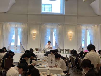 朝食を終え、先生の話を聞いています。