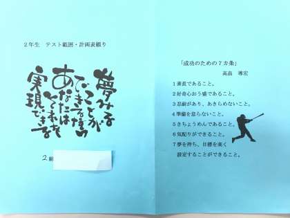 昨日からテスト週間に入り、中間テストに向けて学習に取り組んでいます。休み時間も勉強をして過ごす生徒も増えました。2年生になって初めてのテストで、新たにやる気を出して頑張っている姿を見ることができます。
