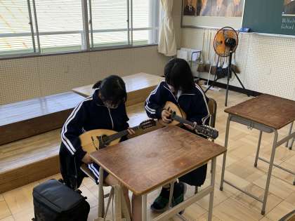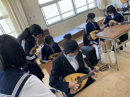 写真は、「ギターマンドリン部」の活動の様子です。3年生が1年生にマンドリンを教えている写真です。1年生は難しい指の運びに苦戦しながらも必死についていこうとしていました。