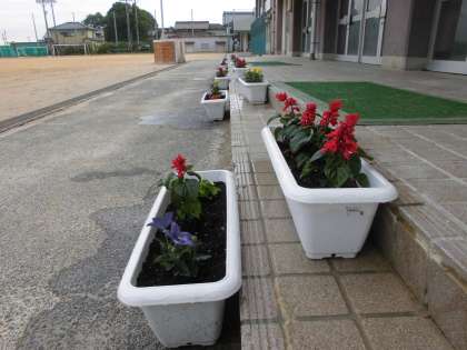 そして、植えたプランターを、2箇所の昇降口に並べました。