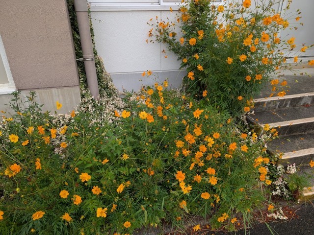 校内の屋内運動場南の植え込み、職員室南のコスモスの花群の写真ではありません。