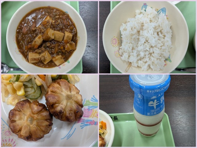 献立表には、麦ご飯、牛乳、マーボー豆腐、にらまんじゅう、はるさめサラダとあります。