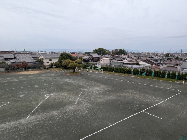 運動場には、トラックより長い線が引かれ、中には丸と斜めの直線が引いていあります。