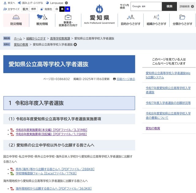愛知県Webサイトに、「令和8年度愛知県公立高等学校入学者選抜実施要項」がアップされました。
