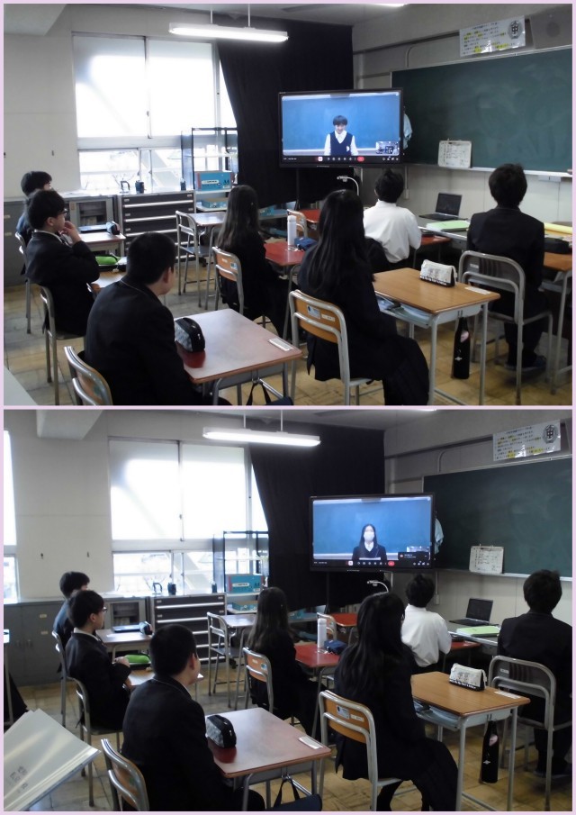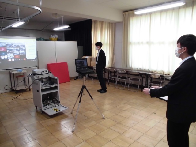 手足の不自由な子どもを育てる運動への協力、赤い羽根共同募金の報告を、担当委員が全校生徒に伝えました。