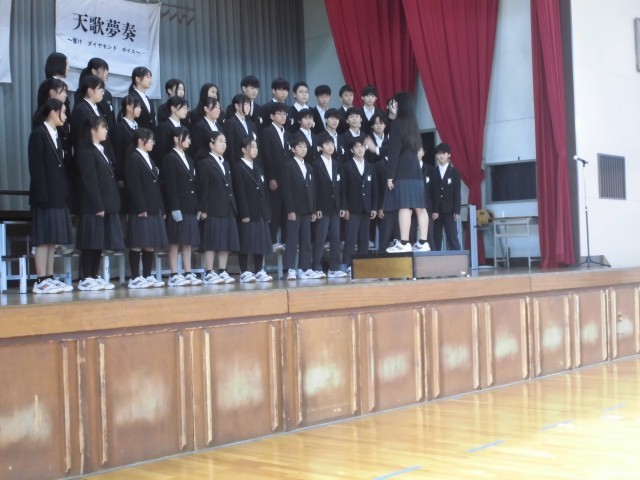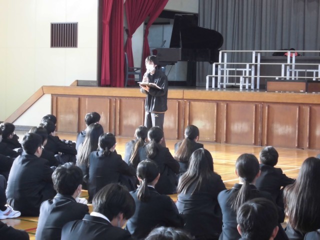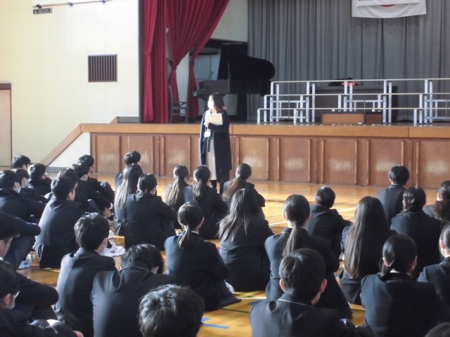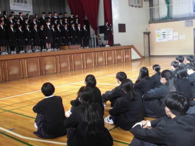 2年生は、本日の5時間目、屋内運動場で2学期最後の学年集会を行いました。まず最初に、合唱祭の日、多数の欠席者が出てしまった2年4組の合唱をみんなで聴きました。合唱祭当日、いつもより少ないメンバーで、欠席した仲間の分も力一杯歌ってくれましたが、やはり全員で歌う合唱を届けたかったという思いを残していました。今日、その思いを叶える場をやっと作ることができました。十分な練習時間はありませんでしたが、すばらしい合唱を聴かせてくれました。他の学級の生徒も4組の生徒の思いをしっかりと受け止めて真剣に合唱を聴き、温かい拍手を送っていました。その後、学年の学習指導担当と生活指導担当から冬休みの過ごし方について話を聞きました。学年主任からは自分の夢を具体的にもつことの大切さについて話がありました。新しい年は、2年生にとって進路を具体的に考える年になります。新しい年が生徒たちにとって希望にあふれた年になることを願っています。